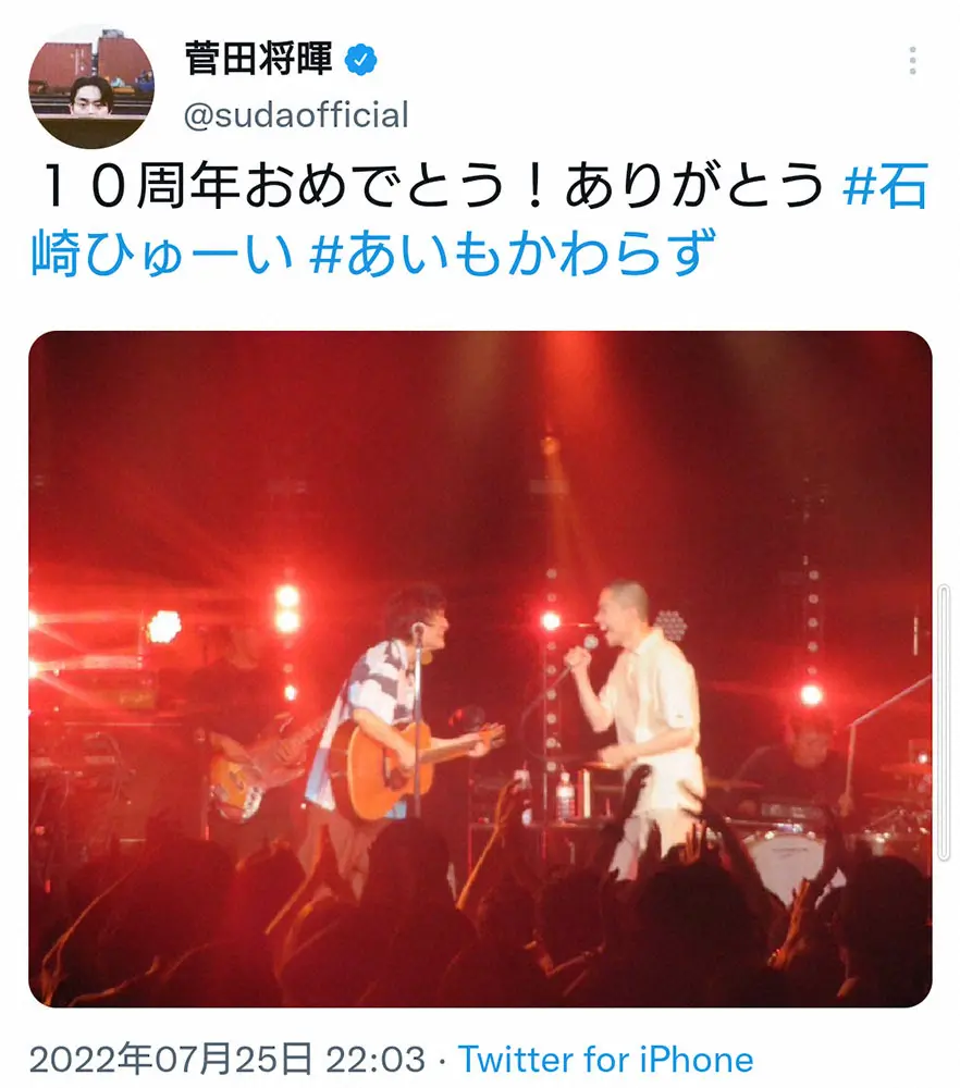 菅田と石崎はかねてから親交が深く、8月2日にはコラボ曲「あいもかわらず」を発売する。石崎は25日にワンマンライブを開催し、菅田もサプライズ参加。ライブの写真を添えて「10周年おめでとう!ありがとう」とつづったもの。