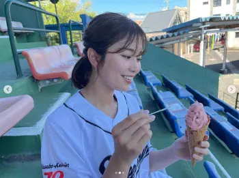 稲村亜美 “競輪ユニホーム”姿でアイスペロリ 「スーパー可愛い」「やっぱりユニ姿最高」の声