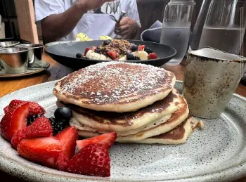 白いTシャツとキャップ姿でメニューを見るダルビッシュの姿や、パンケーキなどの朝食の写真を公開。「美味しかった」と満足気な様子で、ブログを締めくくった。
