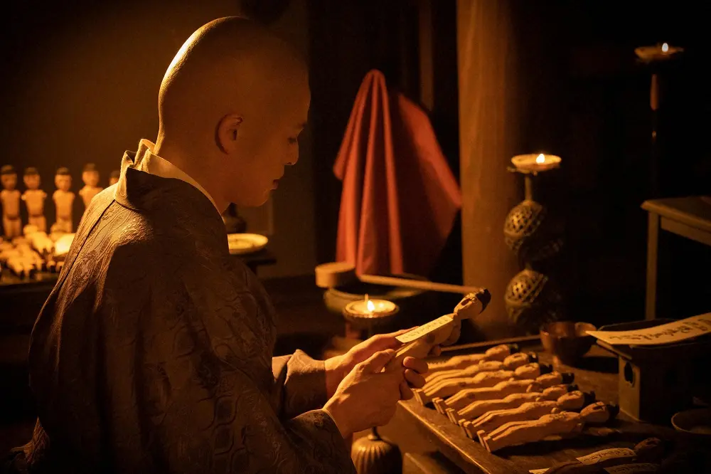 大河ドラマ「鎌倉殿の13人」第29話。呪詛の木人形を作る阿野全成(新納慎也)(C)NHK