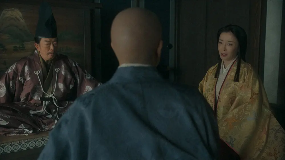 大河ドラマ「鎌倉殿の13人」第29話。阿野全成(新納慎也)に源頼家呪詛を頼む北条時政(坂東彌十郎・左)とりく(宮沢りえ)(C)NHK