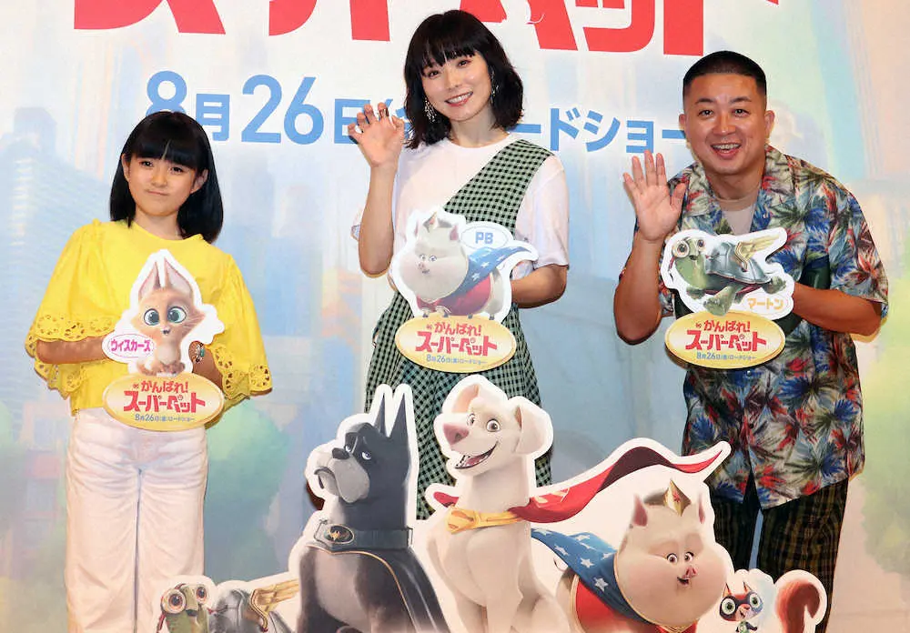 女優の松岡茉優(27)、チョコレートプラネットの松尾駿(39)、舞踊家の市川ぼたん(11)が31日、都内で声優を務めた米アニメ映画「DC がんばれ!スーパーペット」(26日公開)の親子試写会に出席した。
