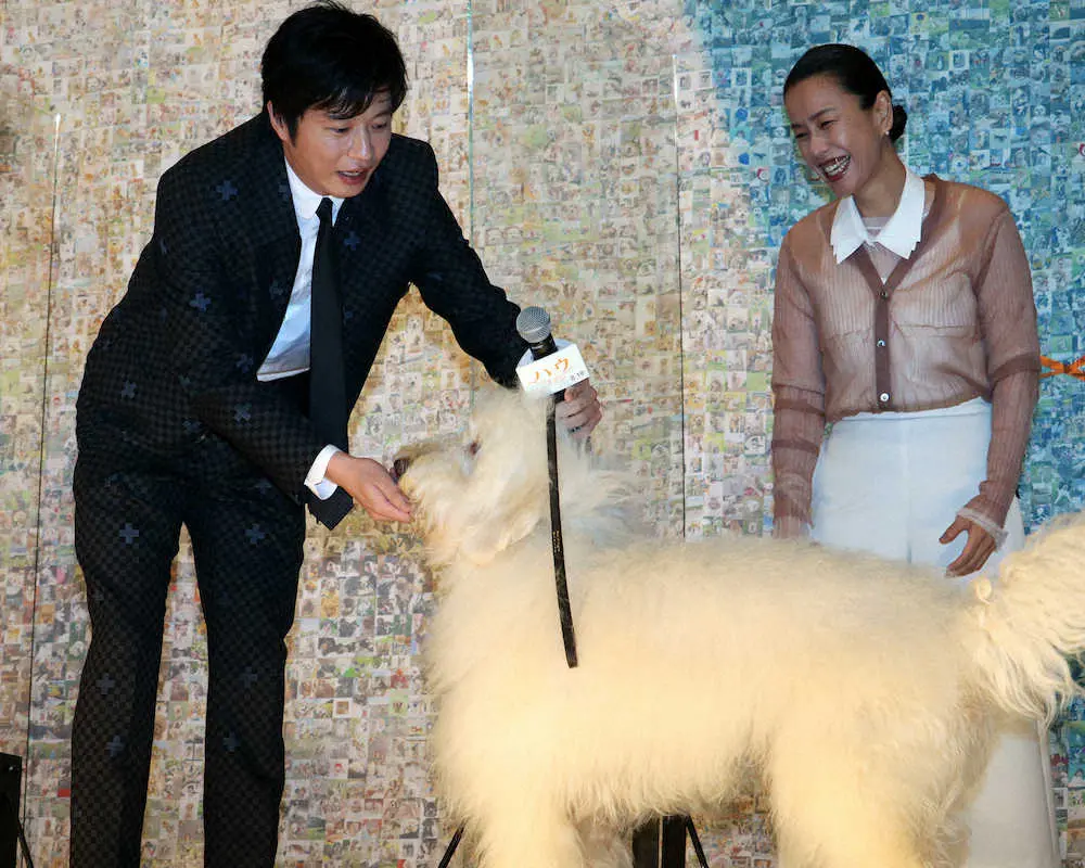 心に傷を負った公務員と、鳴くことができない保護犬の絆の物語。舞台あいさつにはハウを演じたゴールデンドゥードルのベックも登壇し、田中は「やんちゃだけれど、その自由奔放さに癒やされていました。1人(1匹)のシーンでも、ずっと芝居をしている。もう、ズキュンです」と称賛。共演の池田エライザ(26)も、「真っすぐ見つめてくる瞳が好き」とメロメロだった。
