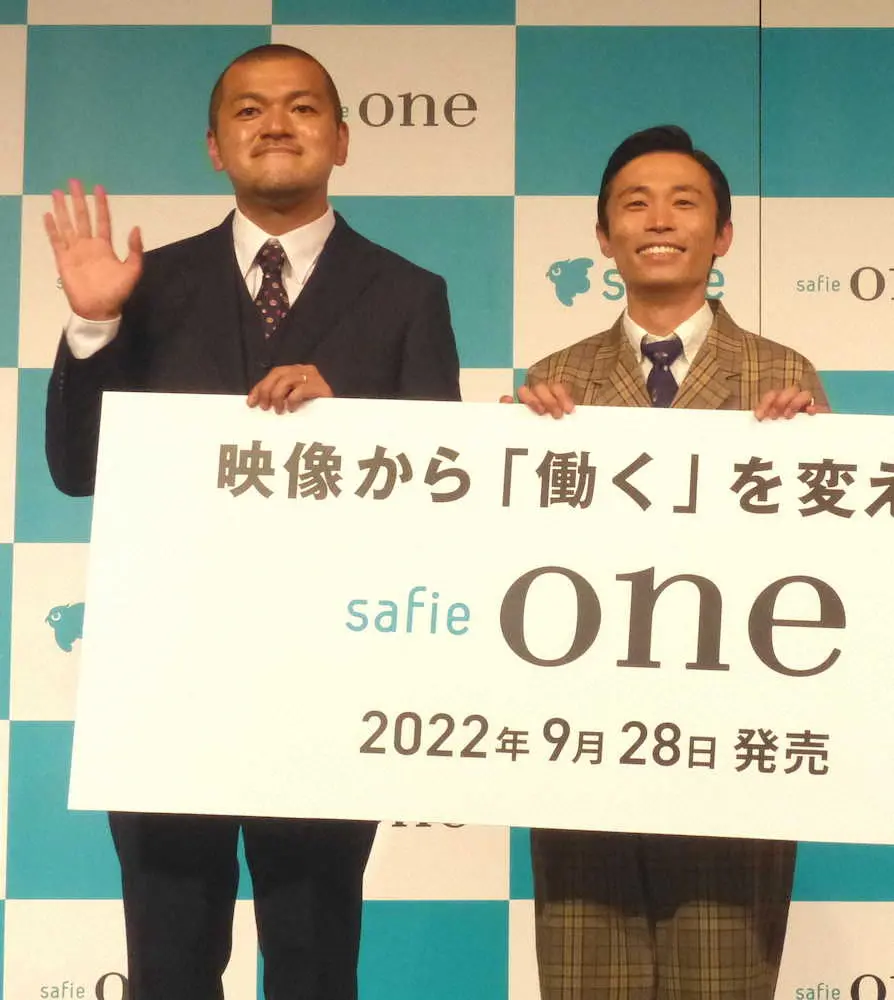 セーフィー新製品発表会に出席したカミナリの竹内まなぶ(左)と石田たくみ