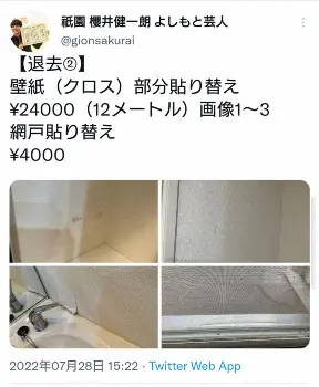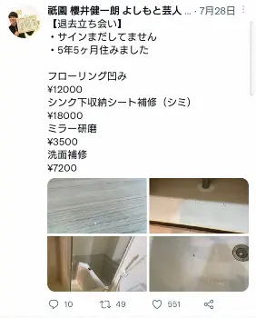 自身のツイッターではその内訳を明記しており「フローリング凹み\12000、壁紙(クロス)部分貼り替え\24000(12メートル)、洗面カバー交換\48000」などとしている。特に、壁紙については「まず言われたのが壁紙。5センチくらいのしみ汚れ24000円。そんなもんなのかな、とこれだけ言われたら払っていたと思うんですけど」としたものの、「後で調べたら 壁紙というのは、新品からどんどん価値が下がって6年で1円という取り決めがあるそうなんです。それを元に請求をされるはず」と説明。さらに「1メートルにつき高くても1200円くらいらしいんですが、5センチに対して12メートル替えないといけないと言われまして、単純計算1メートル2000円ほど」と語った。