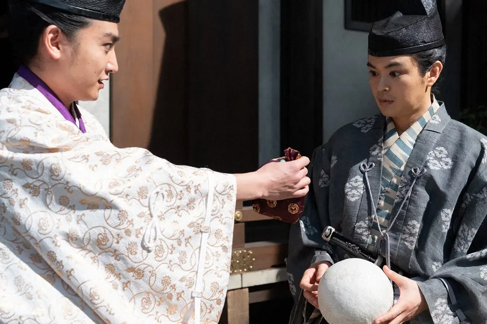 大河ドラマ「鎌倉殿の13人」第30話。北条時連(瀬戸康史・右)の改名報告に、りく(宮沢りえ)と北条時政(坂東彌十郎)の反応は…(C)NHK