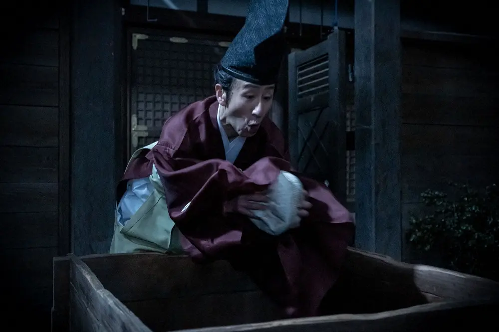 そこへ現れた平知康(矢柴俊博)に、頼家が「わしはもう蹴鞠に逃げることはせぬ。お役御免。ご苦労」と蹴鞠を投げると、取り損ねた知康は体勢を崩し、古井戸に落ちる。