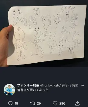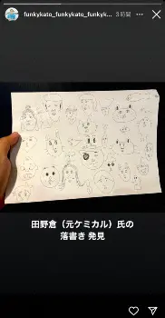 さらに、加藤は「田野倉(元ケミカル)氏の落書き発見」とコメントし、DJケミカルが描いたイラストを公開。ファンからは「相変わらずの画伯っぷり笑」「グッズにして下さい」との声が上がった。