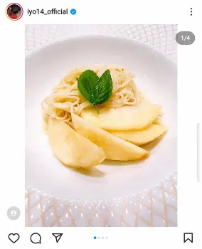 松本は「りょおがお素麺で桃のカッペリーニふう作ってくてた。おいしぃー。この時期ならではだな。いつも美味しいもの作ってくれるな 我が家で一番料理のセンスあるかも。。な。勝手にryo's cookingと言っている」とつづり、自宅で育てたというバジルの葉を乗せた一品の写真を投稿した。
