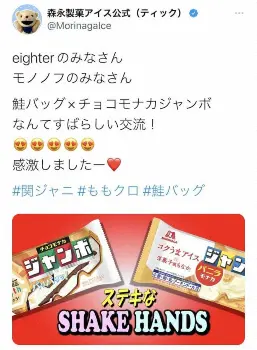 森永製菓が関ジャニ∞とももクロのファンに粋なツイート「ステキなSHAKEHANDS」鮭バッグ巡り交流