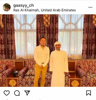そんな中、「アラブ首長国連邦(UAE)はアブダビやドバイをはじめとした七つの首長国が合わさった連邦国家です。昨日はその中の一つであるラスアルハイマ(RAK)のロイヤルファミリーのサレム殿下を表敬訪問致しました」と殿下との2ショットを掲載した。