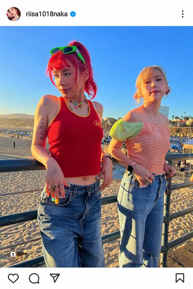 仲は現在、長男や妹のれいなたちと米国に旅行中。この日は自身のアパレルブランド「RE.」の服を着た写真を投稿したもので、米国に行く前に染めた真っ赤な髪をポニーテールにし、赤いタンクトップにジーンズ姿で妹のれいなと写真に納まっている。