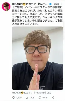 HIKAKINは「ご報告」として「イベント中にステージで不審者に接触されたのですが、わたくしヒカキン怪我など一切なく、無事でした。メンタル的な部分に関しても大丈夫です。ショッキングな映像が流れてしまい申し訳ありません。ご心配ありがとうございます」とつづったもの。