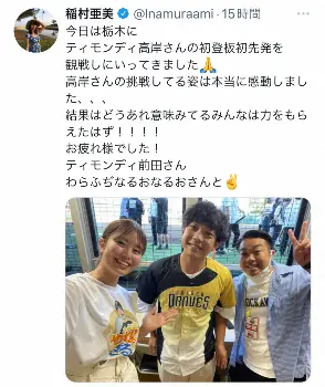 稲村亜美公式ツイッター(@Inamuraami)から 稲村亜美 ティモンディ高岸のプロ初登板を現地観戦「挑戦してる姿は本当… ギャラリーで見る この記事のフォト 2022年08月15日の画像一覧 もっと見る 2022年08月15日の画像をもっと見る
