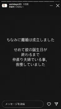 坂口さんはストーリーズの中で「ちなみに離婚は成立しました」と報告。夫の誕生日は8月14日で、「せめて彼の誕生日が終わるまで仲直り夫婦でいる事、我慢していました」と説明した。