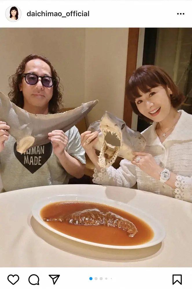 「昨日8月12日に、10日後の『8月22日入籍記念日』お祝いをしました」とつづり、仲睦まじい1枚を披露。「明日からドラマの撮影が再開します。大好きなコラーゲンを補給して…また頑張ります~~~」とし、フカヒレやすっぽん、天然うなぎなどのコラーゲン豊富な料理に舌鼓を打ったことを明かした。