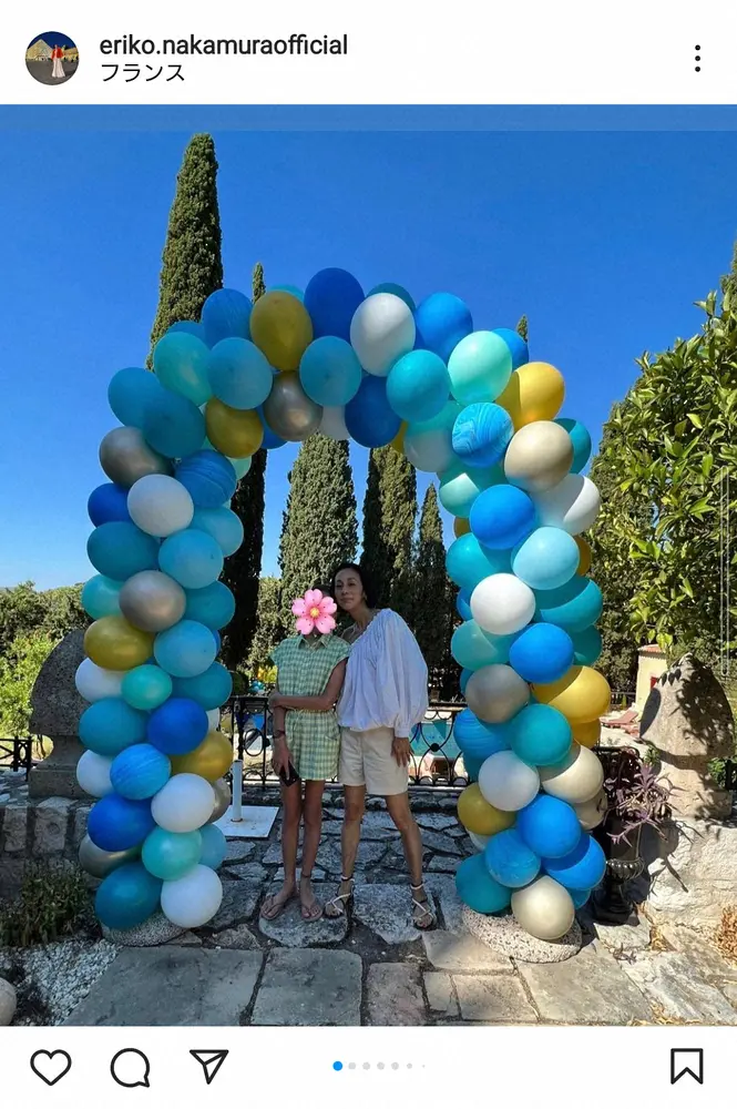 前投稿で現在は南仏に滞在しているとしていた中村は「我が家のちびっ子ギャング&可愛い怪獣ちゃんも数日前に12歳になりました もう、風船とか、可愛いデコレーションでのパーティーも最後かなあ?」と記すと、風船が飾られた庭での白のワンショルダーのブラウスにベージュのショートパンツ、サンダル姿の自身とワンピース、黄緑色のチェックのワンピースにサンダル姿の次女との2ショットをアップした。