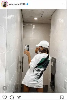 さらに「背中に浜田さん背負ってまた本日から働きまくります!笑」と、背中にダウンタウン・浜田雅功の顔がプリントされたTシャツを着て、Vサインする写真を掲載した。