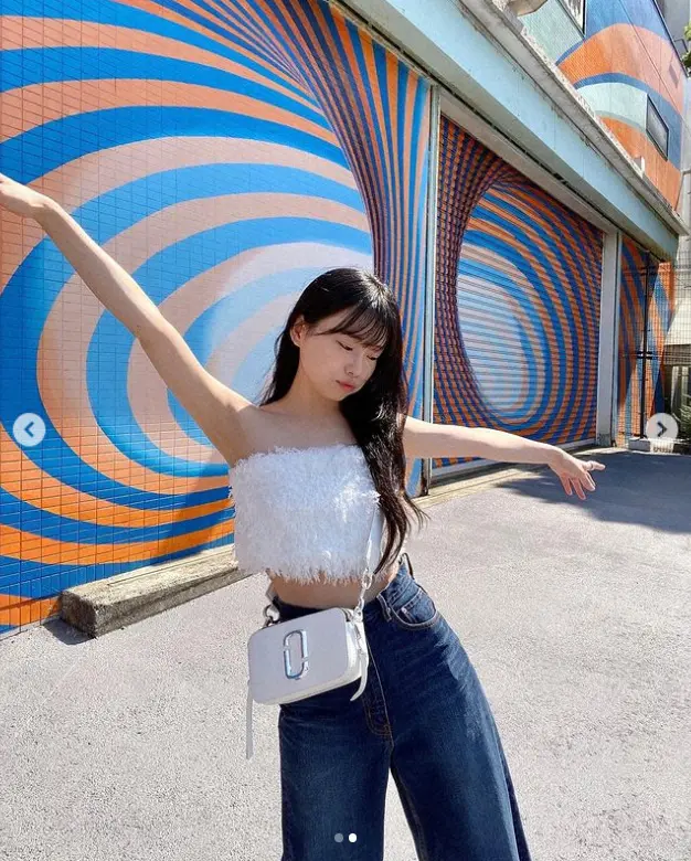 ハートマークの絵文字を6個並べて、白いフェザーのチューブトップ、ジーンズ姿でクビれたウエストをのぞかせている写真をアップした。