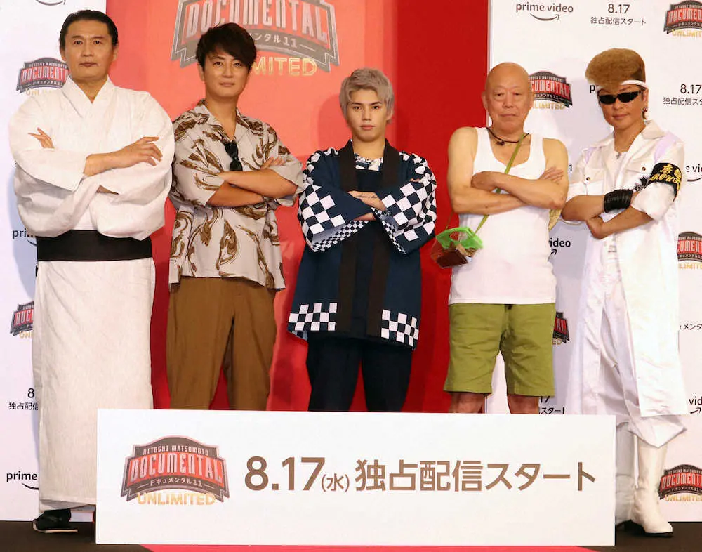 ダウンタウンの松本人志(58)が企画・プロデュースのAmazonプライムビデオ「ドキュメンタル シーズン11 UNLIMITED」の配信(きょう17日から)記念会見が16日、都内で行われ、元横綱の貴乃花光司氏(50)、「氣志團」の綾小路翔らが出席した。