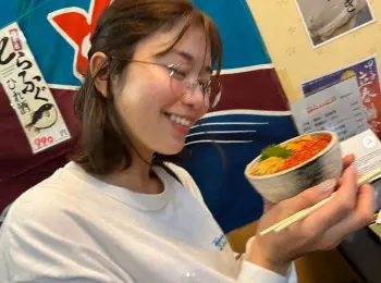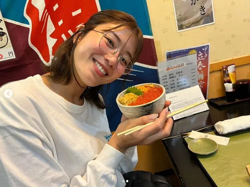 「海鮮丼 寝起き3分で食べに来ました」とつづり、眼鏡姿で海鮮丼を手に笑顔を見せている写真をアップした。