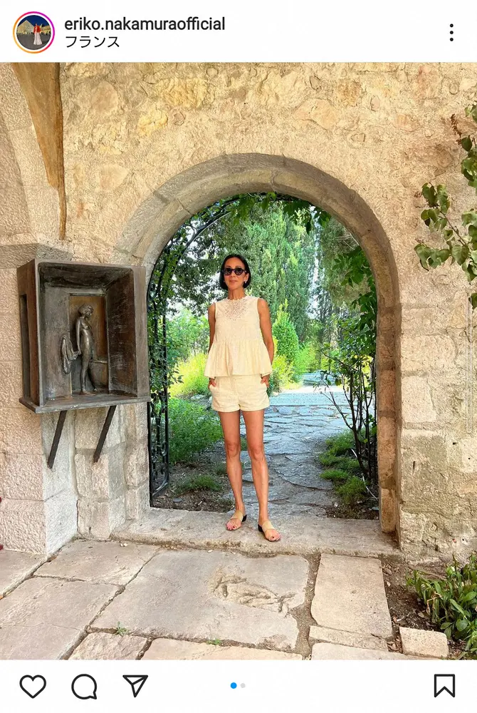 これまでの投稿で現在南仏に滞在しているとしていた中村は「日中の暑さは厳しいのですが、朝晩は気温が下がるようになり過ごしやすくなってきました。ある日、こんなスタイルで!!ショートパンツもここでなら思い切って着られる」と記すと、アイボリーのノースリーブのトップスに、同色のショートパンツ、サンダル、サングラス姿の全身ショットをアップ。「ディナーの時には同素材の黒のロングスカートに替えれば、全く雰囲気が変わります 7.8年前の @zhornema のもの。サンダルはもう25年以上前のフェラガモですが、まだ頑張ってくれています」と説明した。