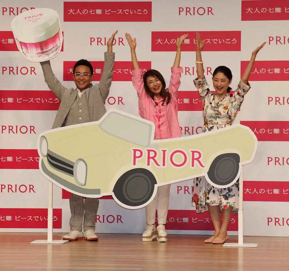 化粧品ブランド「PRIOR」のお披露目会に出席する(左から)八嶋智人、風吹ジュン、常盤貴子