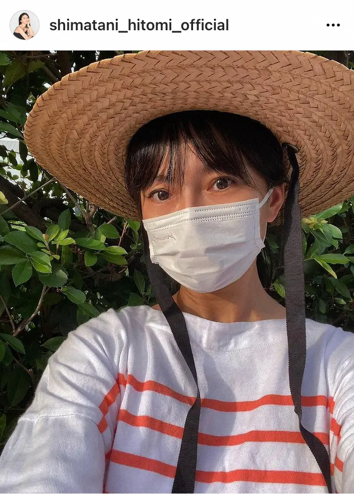 ハッシュタグでも「#しまたに復活」「#お散歩」「#暑い」と添え、マスク姿で麦わら帽子をかぶったお散歩ショットを公開した。