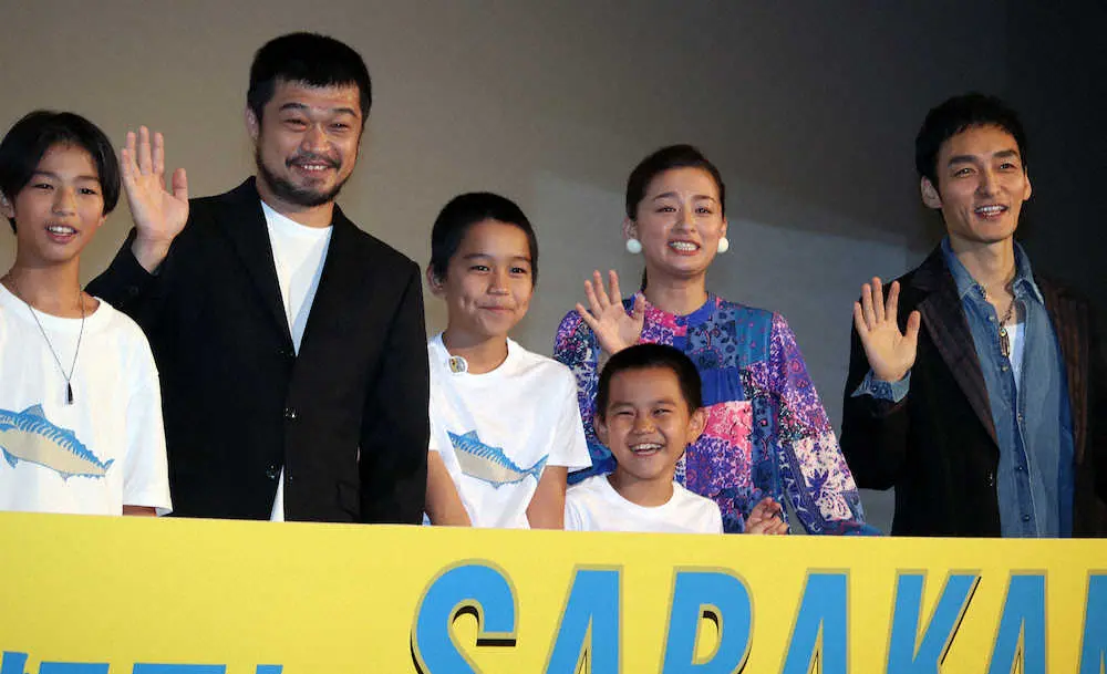 映画「サバカン SABAKAN」の初日舞台あいさつを行った(左から)原田琥之佑、竹原ピストル、番家一路、番家天嵩、尾野真千子、草なぎ剛