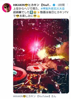 ヒカキン 200万円かけて上空から神宮外苑花火大会観覧「超綺麗でした」