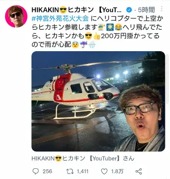 ヒカキンは花火大会開催前に「ヘリコプターで上空からヒカキン参戦します ヘリ飛んでたら、ヒカキンかも 200万円掛かってるので雨が心配」とつづっていた。