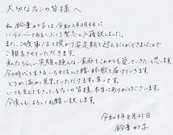 最後には「良い音楽と楽しい空間を共有できるように私たち二人とも成長を重ね、家族のような幅広い世代のファンの皆様とかけがえのない時間をたくさん作っていきたいと思っています。今後とも、どうぞよろしくお願いします」とした。