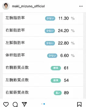 続けて「驚いたのは四肢それぞれの筋肉量やら脂肪率が出ること。元々下半身に“ボリューム”が出るタイプと思っていたけれど、数値化されたものを見たら見たで結構ショック。足の脂肪率は腕の脂肪率の二倍以上でした」と脂肪率や筋肉量の詳細を添えた。