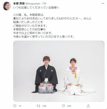 本郷は「この度、私、本郷杏奈は、兼ねてよりお付き合いしておりましたEXITのりんたろー。さんと結婚いたしましたことをご報告させていただきます」と発表。