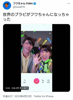続けて「世界のブラピがフワちゃんになっちゃった」と、フワちゃんになれるフィルターアプリを使って2ショットを撮影する動画も公開。ピットも「ワーオ」と楽しそうな表情で、フォロワーからは「ブラピ神対応」「ブラピ可愛いけど、何回見てもフワちゃんの英語力聴き入っちゃう ギャップすぎ」「世界のブラピをフワちゃんにさせるなんてフワちゃんにしかできない」「ブラピかっこいいけど、フワちゃんの英語力もめっちゃかっこい!!」「普通に会話してるフワちゃん、かっこいいよ!」などのコメントが寄せられた。