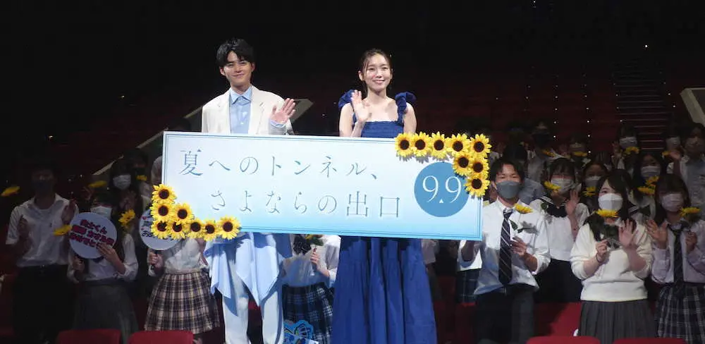 俳優の鈴鹿央士(22)と女優の飯豊まりえ(24)が24日、都内で声優としてダブル主演を務めるアニメ映画「夏へのトンネル、さよならの出口」(監督田口智久、9月9日公開)の高校生限定試写会に出席した。