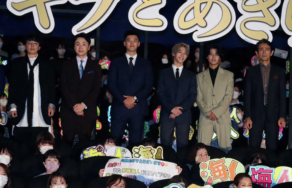 映画「アキラとあきら」の初日舞台あいさつに出席した(左から)ユースケ・サンタマリア、児嶋一哉、竹内涼真、横浜流星、高橋海人、江口洋介