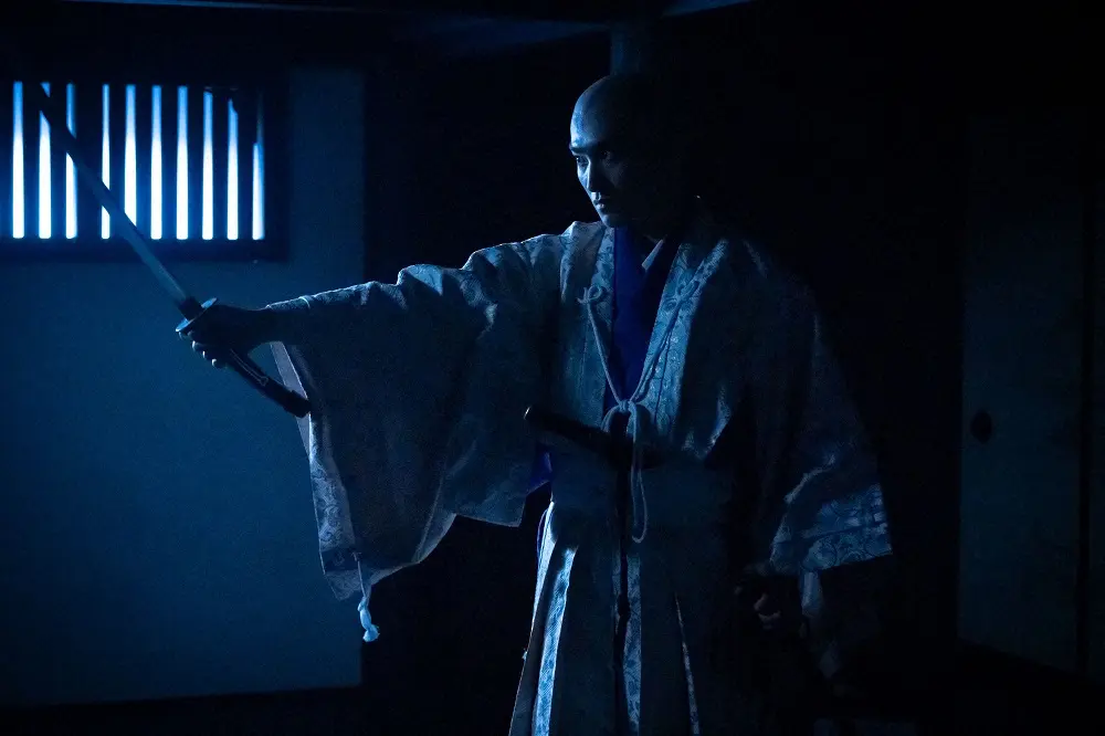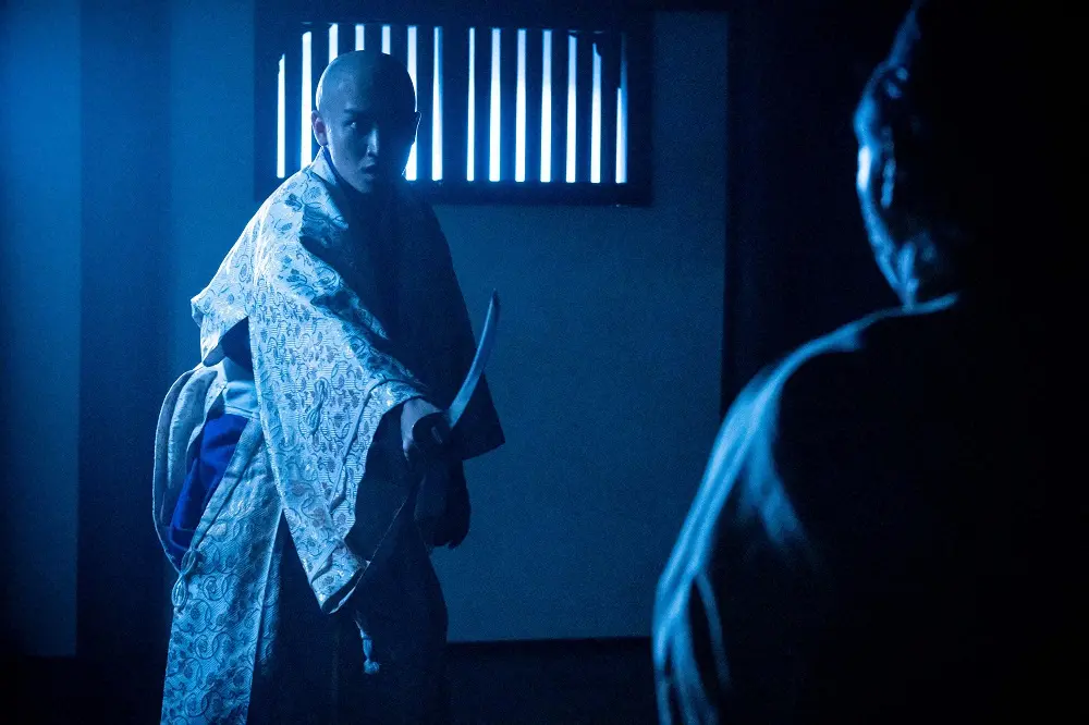 大河ドラマ「鎌倉殿の13人」第33話。善児(梶原善)の一瞬の隙を突く源頼家(金子大地・左)(C)NHK