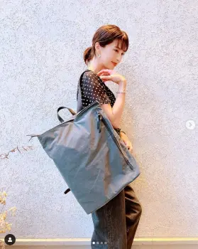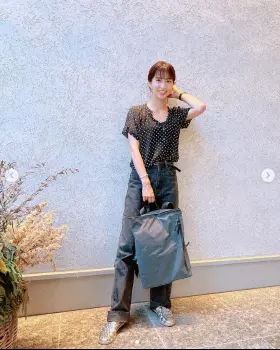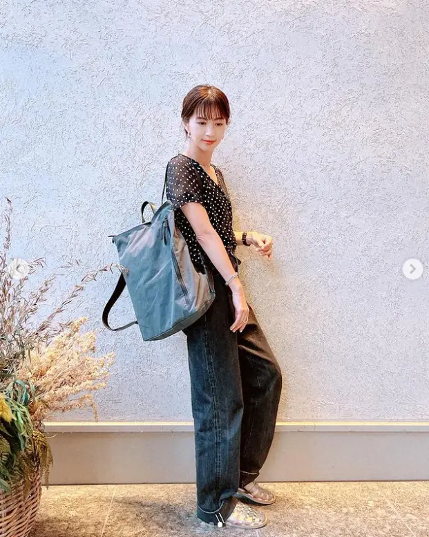 「先日の京都のお仕事に、たっぷり入るリュックを連れて行きました」などとつづり、ドット柄の半袖トップス、デニムにリュックを持っている写真をアップした。