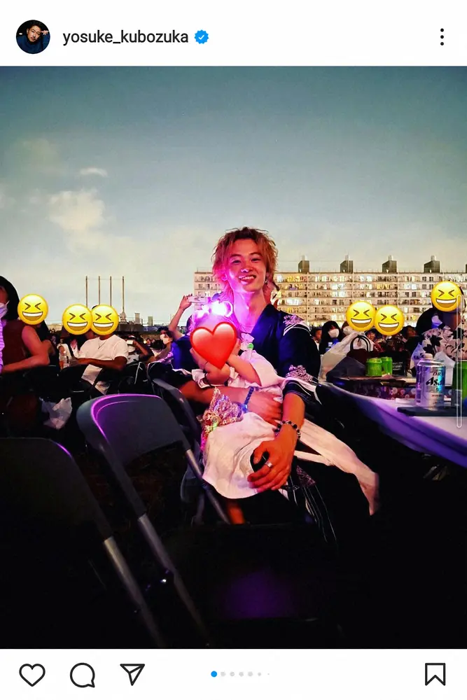 窪塚は「淀川花火大会 日本の夏の風物詩。重力に逆らって夜空に舞う宝石a.k.a.花火 今年は3年ぶりの淀川花火大会を河川敷で納涼~」と記すと、河川敷で浴衣姿の愛流が長女を抱いて椅子に腰かけるショットをアップ。「て、人多過ぎ&冒頭で娘ギャン泣きで喰らったけども それも2022夏の背中、良き思い出入りで」とつづった。