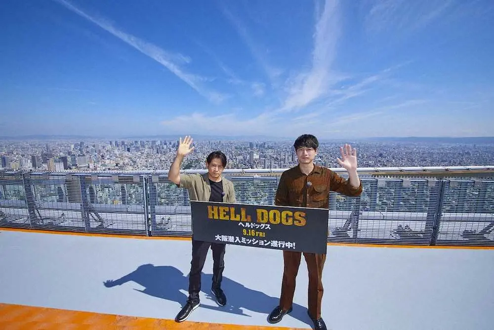 その後、通天閣の最上階“跳ね出し展望台”へ。足元がスケルトンになっている地上92.5メートルの展望台にも、2人は恐怖感はないようで、「風が気持ちいい」と余裕の表情。「関西の皆さん!映画『ヘルドッグス』見に来てや~!」と関西の街に声をとどろかせた。