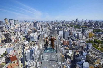 続いて、日本一の高さを誇る商業ビル「あべのハルカス」に潜入。普段は一般公開されていない最上部ヘリポートまで登り詰めた。高さ300メートルを超える最上部からの景色に2人は大興奮。岡田が「今、太陽に近くてすごくまぶしいので、坂口くんの目がビリケンさんみたいに細くなってる」とイジると、坂口からも「岡田さんもビリケンさんの目になってますよ」。劇中のごとく“怒とうの勢いで登り詰めた”日本一高い商業ビルから、「日本中の皆さん、ぜひこの波に乗るよように映画を見てください!」と訴えていた。