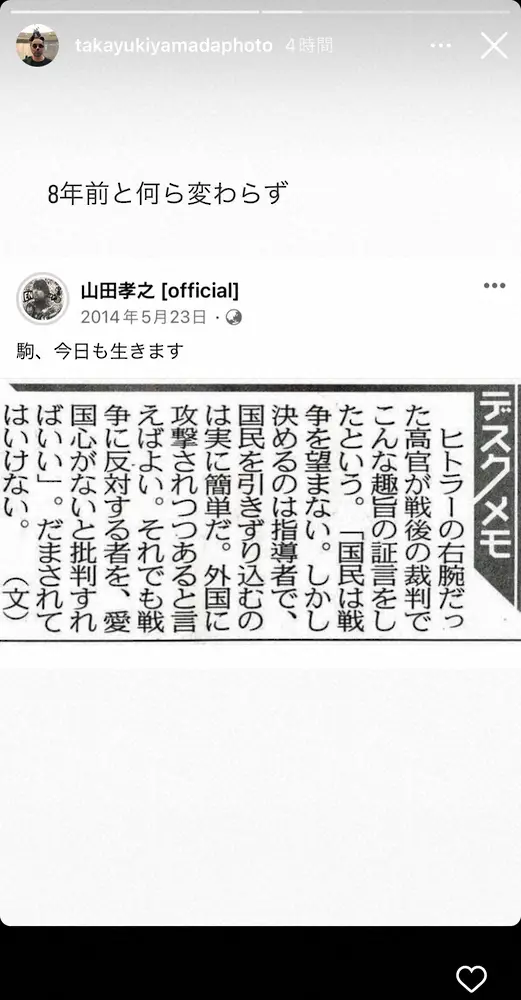 山田は、2014年5月に自身のフェイスブックで投稿した記事を引用し「8年前と何ら変わらず」とコメント。記事では、ヒトラーの右腕だったとされる高官が「国民を戦争を望まない。しかし決めるのは指導者で…」などと発言したことが取り上げられており、8年前の山田は「駒、今日も生きます」とつづっていた。