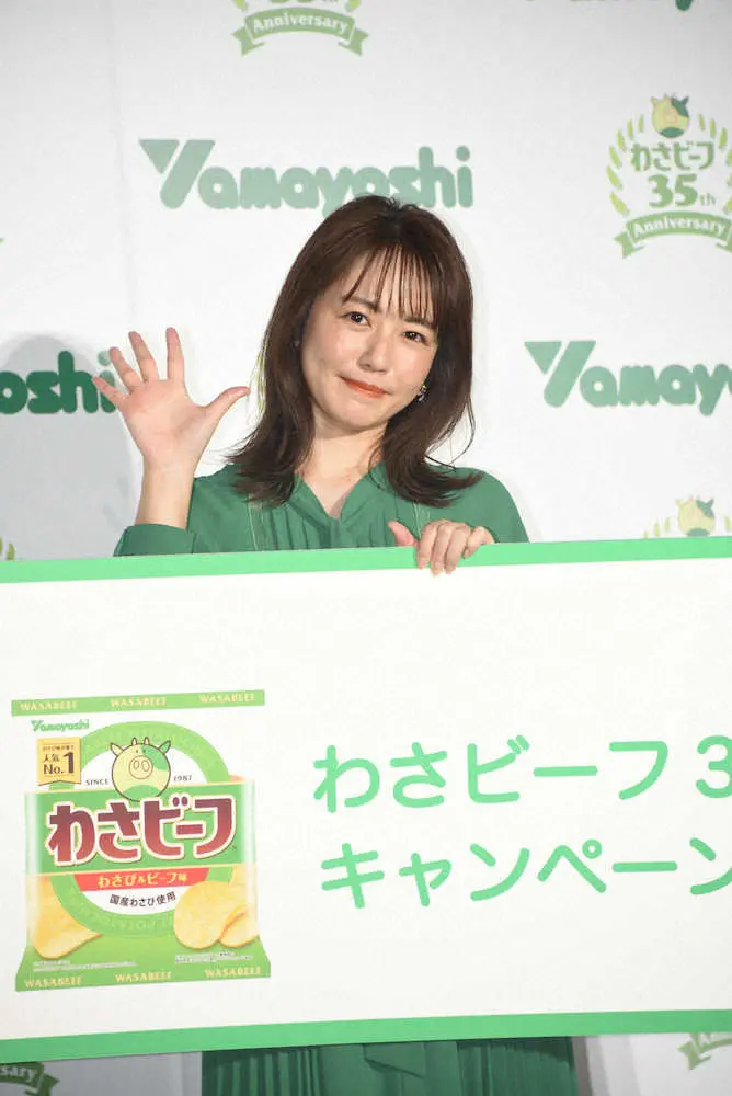 タレントの磯山さやか(38)が1日、都内で行われた「わさビーフ35周年記念キャンペーン発表会」に出席した。この日は「わさビーフ」をイメージした鮮やかな緑のロングワンピースで登場。「3歳から大好きで、わさびのツーンで大人になった感じでした」と思い出を話し、「おやつからおつまみまで、幅広い年代に楽しんでもらえるものだと思います」と笑顔を見せた。