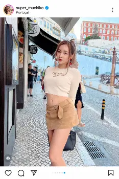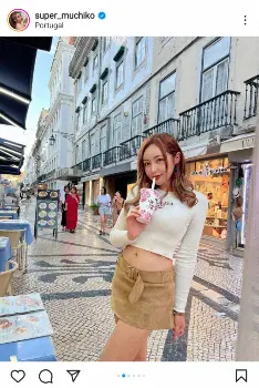 「ポルトGIRL」と書き出すと、街角でのオフホワイトのプラダのへそ出しの長袖トップスにキャメルのミニスカート姿で黒のバッグを手にしたショットをアップ。街中でドリンクを飲む姿や、ポーズを決める別ショットも投稿した。場所は「ポルトガル」と英語で記されている。