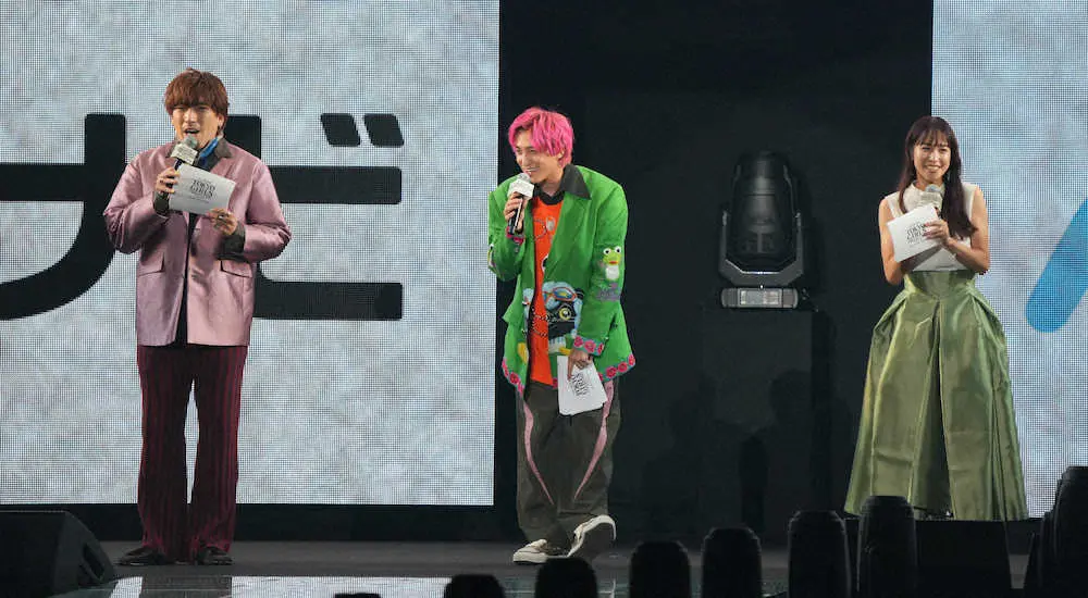 <第35回 マイナビ 東京ガールズコレクション 2022 AUTUMN/WINTER>MCを担当する(左から)EXITのりんたろー。と兼近大樹、鷲見玲奈(撮影・郡司 修)