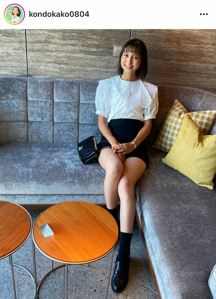 近藤アナは「お母さんとのランチコーデ 買ったのにきてなかったシャツを見つけて慌てて着ました」と白いブラウスに黒のショートパンツを合わせた私服姿を投稿した。