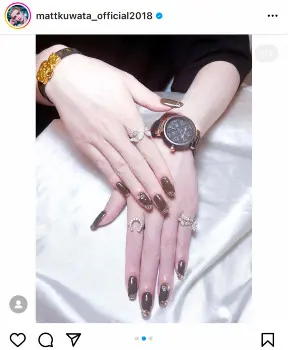 Mattは「秋ネイル アクセサリーに合わせてグレージュ系ブラウンとゴールドの組み合わせ たまにチョコレートにも見えて食べたくなります」とつづり、秋ネイルにアクセサリーを合わせた手元の写真をアップした。