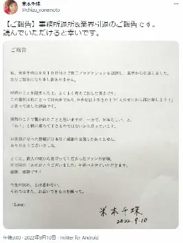 「突然のことで驚かれたことと思いますが、一方で、米本らしい、と。『あ!』と腑に落ちて下さるのではないかと思っています。お世話になった皆様には本当に感謝の言葉しかありません。ありがとうございました。とくに、新人の頃から見守ってくださったファンの皆様。百万回の『ありがとうございました』を述べさせてただきます。感謝、感謝です!今生の別れ。とは思わない。それではまた、お会いできる日を願って 『Love』」と記し、直筆の署名で結んだ。