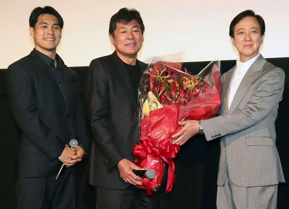 映画「AKAI」の公開記念舞台あいさつに駆け付けた坂東玉三郎(右)に花束を贈られ笑顔の赤井英和(中央)。左は長男の赤井英五郎監督